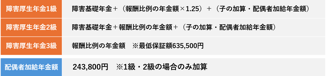 ※配偶者加給年金額:障害厚生年金の1級または2級を受給する方に、生計を維持されている65歳未満の配偶者がいる場合に加算されます。